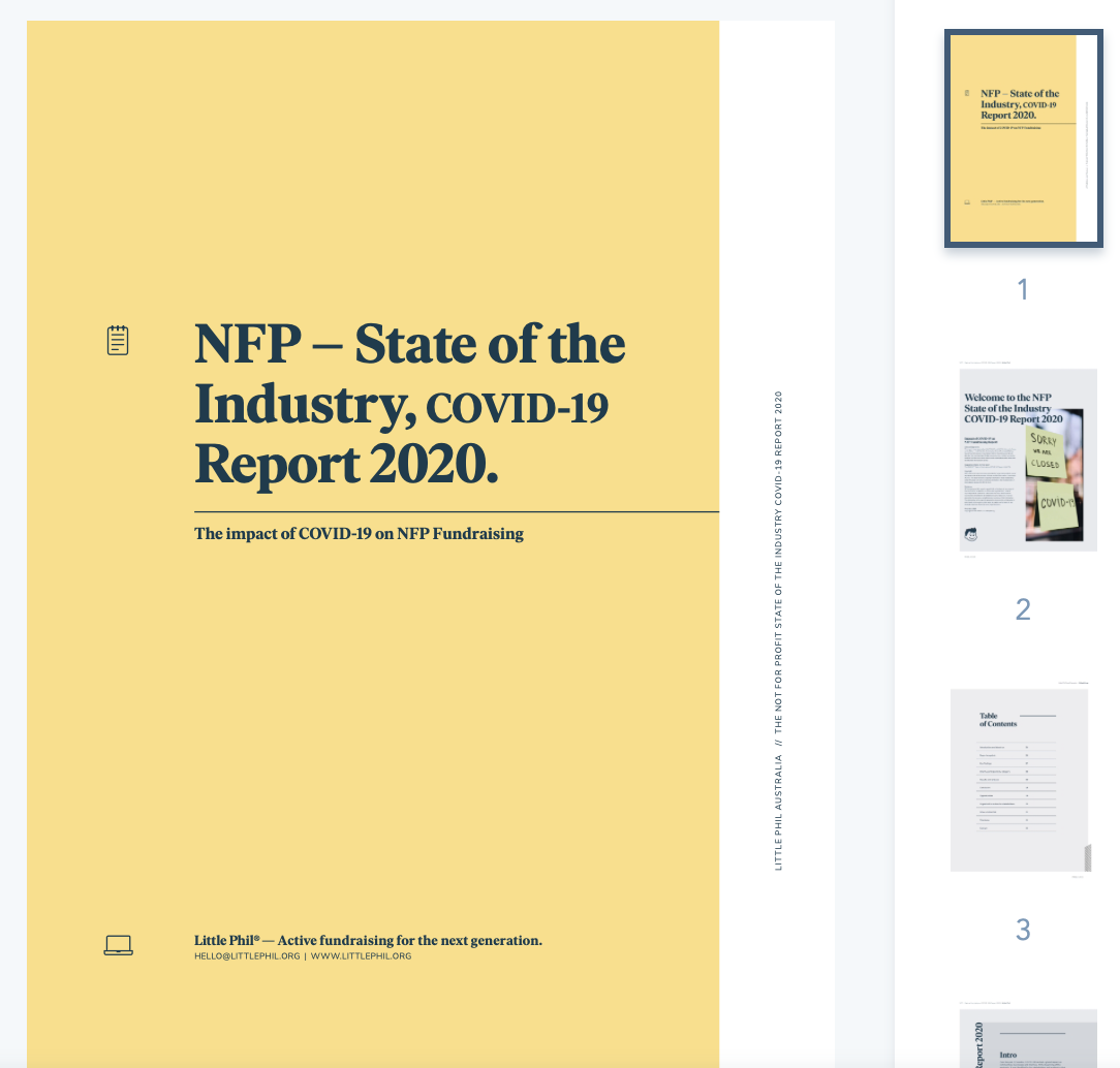 State of the Industry Report analysing the impacts of COVID-19 on the charitable and not-for-profit sector in Australia. Completed for www.littlephil.org and Griffith University Yunus Centre.